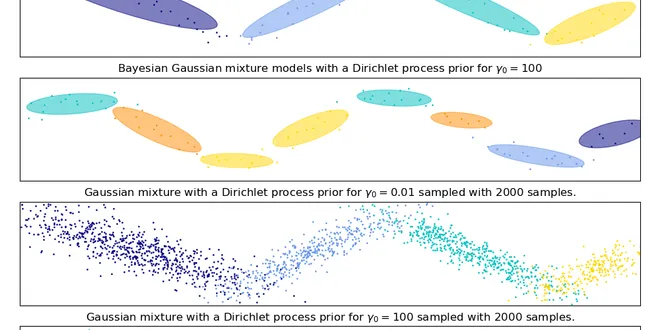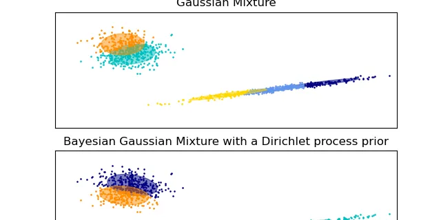 Gaussian Mixture Model Ellipsoids Plot the confidence ellipsoids of a mixture of two Gaussians obtained with Expectation Maximisation ( GaussianMixture class) and Variational Inference ( BayesianGauss...