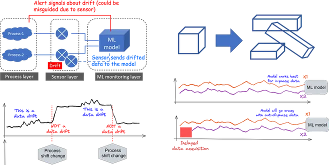 The concept of data drift is illustrated visually in various shapes and forms in the context of machine learning applied to industrial problems with time-series data. This is a critical consideration ...